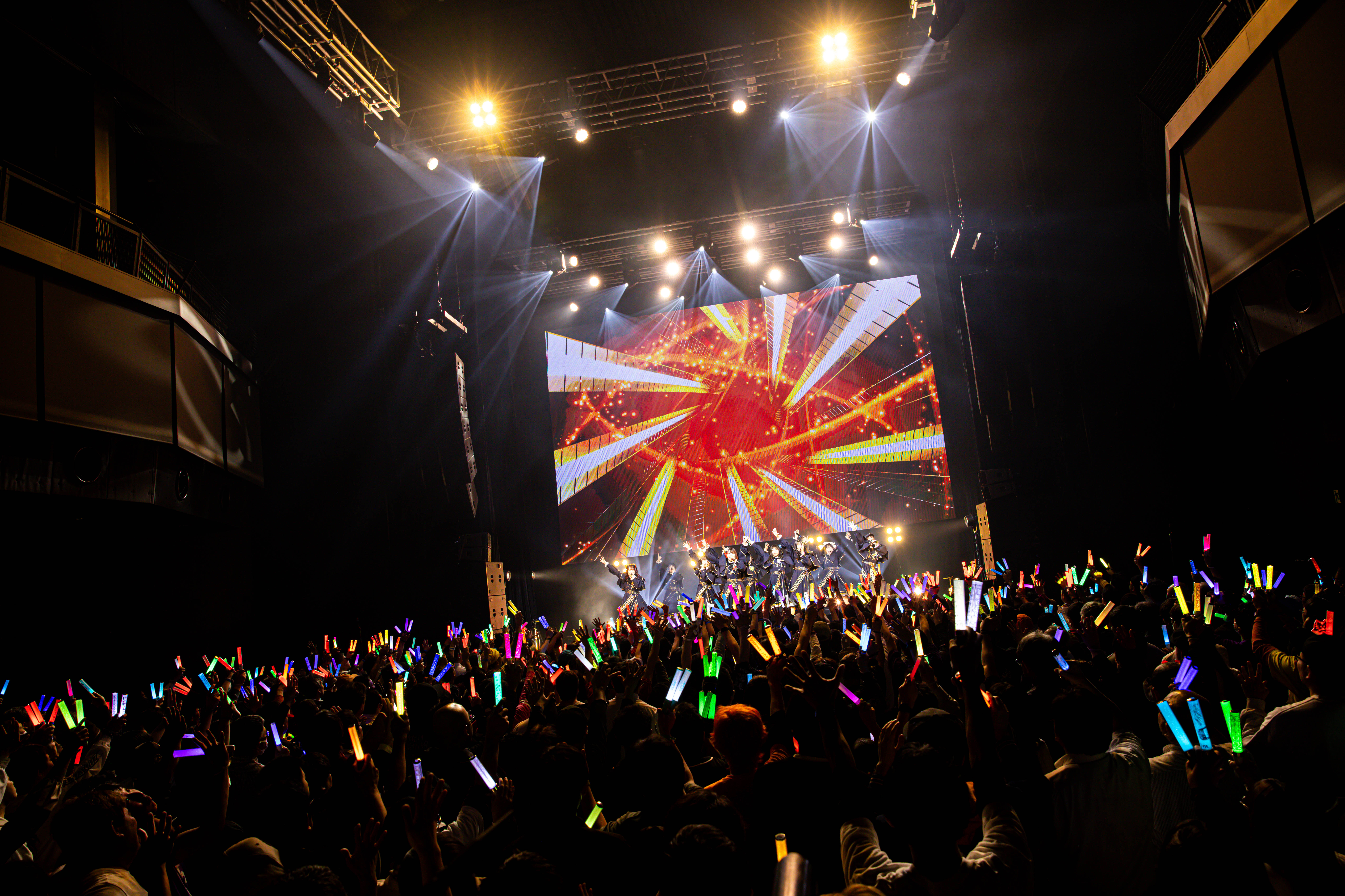 開場まもなく、フロアは「村人T(ファンの呼称)」で埋め尽くされ、ステージ巨大スクリーンにはメンバー紹介と協賛企業「整体×骨盤 カラダファクトリー」のCMが流れている。